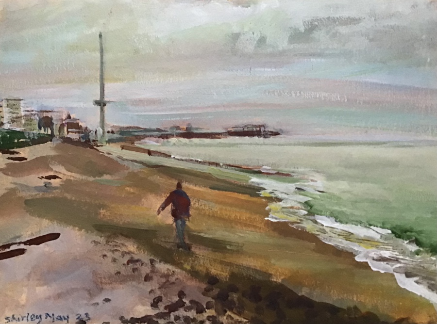 "Walker on Hove Beach" (Plein air, 28 x 37 cms, acrylic on paper, £120 unframed)